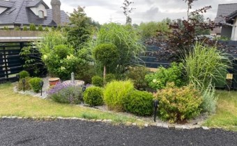 Działka przepięknie zagospodarowana: liczne nasadzenia roślin ozdobnych, krzewów (porzeczka, agrest, borówka) i drzew owocowych (czereśnia, wiśnia, grusza, jabłoń). Na działce znajduje się ponadto letni domek (bez ogrzewania), oraz magazynek na na sprzęt ogrodniczy. Posesja jest ogrodzona, wjazd na posesje obywa się poprze bramę przesuwną sterowaną elektrycznie. Podjazd do budynku i garażu, oraz taras wyłożony jest kostką brukową. Brama garażowa również otwierana automatycznie
